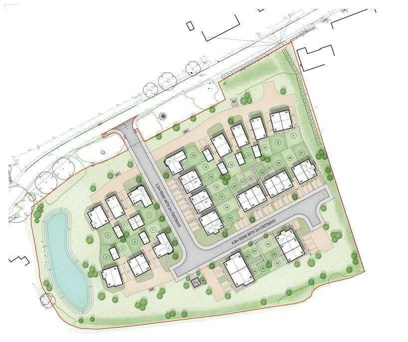 The scheme has been designed to maximise the site’s existing features, orienting the new plots to form outward facing development and address open spaces, and utilising the natural fall of the land to provide sustainable drainage.